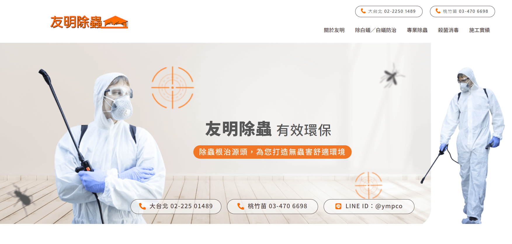 經營項目:除白蟻、老鼠、蚊蠅、蟑螂、跳蚤、消毒殺菌除臭、covid-19除菌。